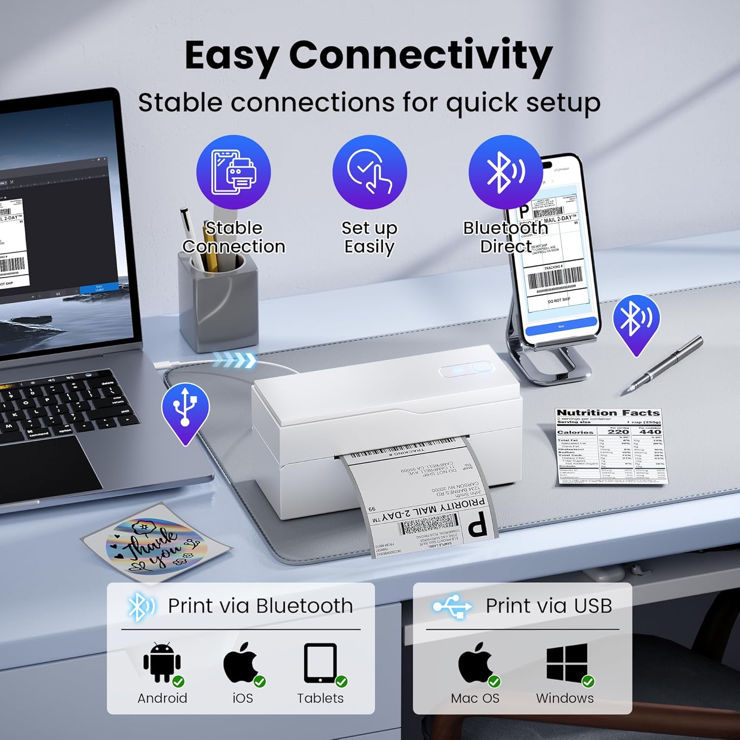 Bluetooth Thermal Label Printer – 4x6 Shipping Label Printer for Small Businesses & Shipping Packages, Compatible with Android, iPhone, and Windows, Ideal for Amazon, eBay, Shopify, Etsy (White)