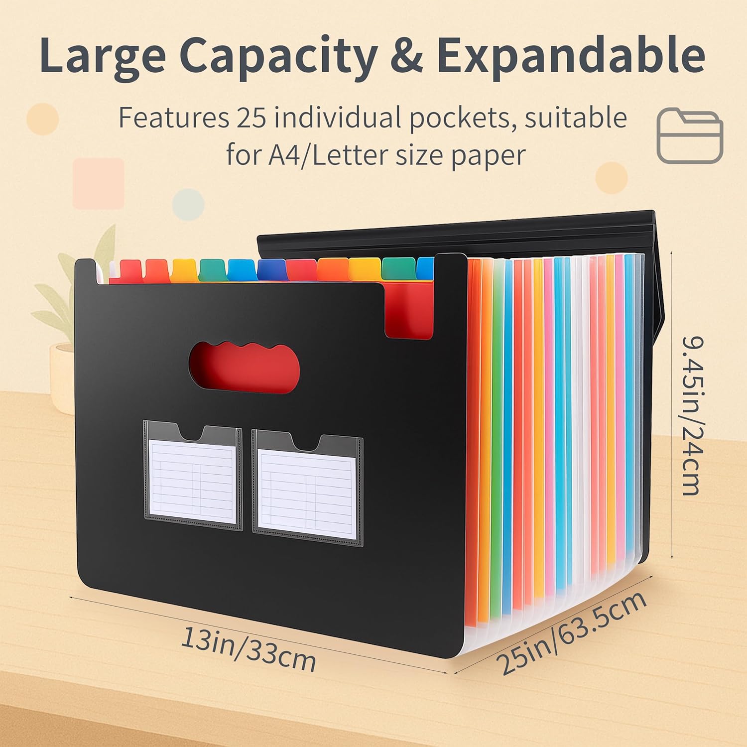 - Large Capacity & Expandable Design: This set includes 2 expandable file folders, each featuring 25 pockets suitable for A4 and Letter-size paper. With the accordion-style design, they can expand to 25 inches with a fully enclosed bottom to keep your documents secure and prevent slippage.