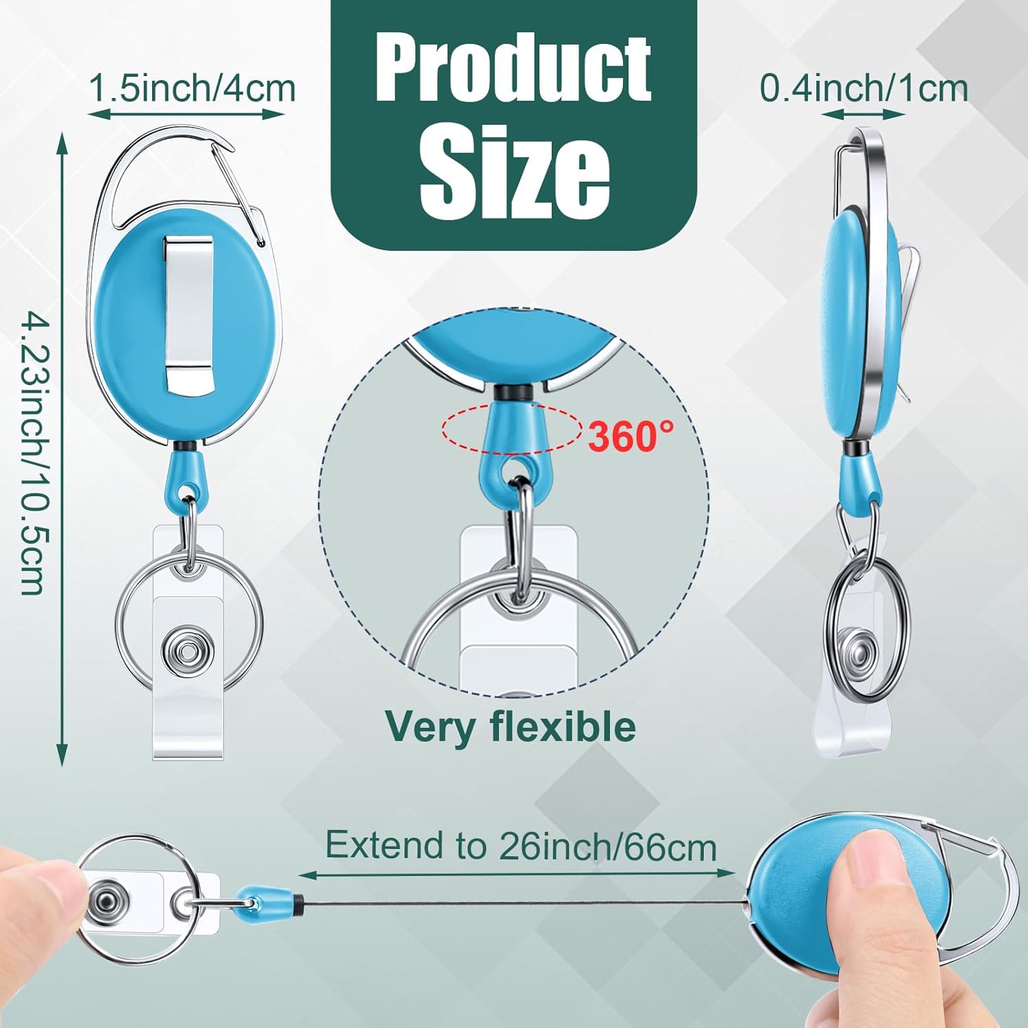 - Size: retractable keychain size is 4.13 x 1.57 inch/ 10.5 x 4 cm, designed with a retractable cord, can extend up to 26 inch/ 66 cm long, the retraction mechanism is very smooth, will not get stuck, and not easy to break, easy to enter and exit various places