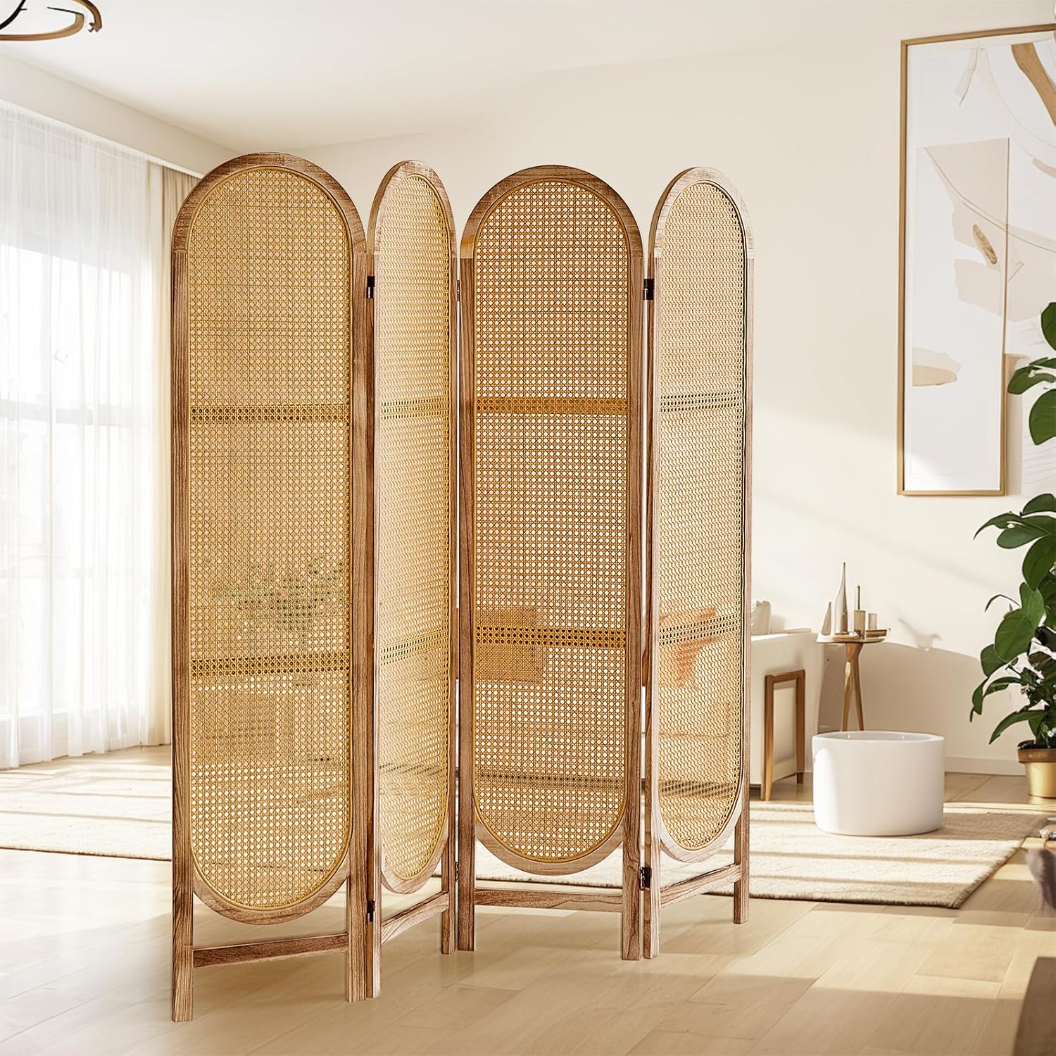 4 Panels Room Dividers and Hand-Woven Rattan Room Divider Wall, Wood Room Divider Folding Privacy Screens for Home Office Bedroom, Light Brown