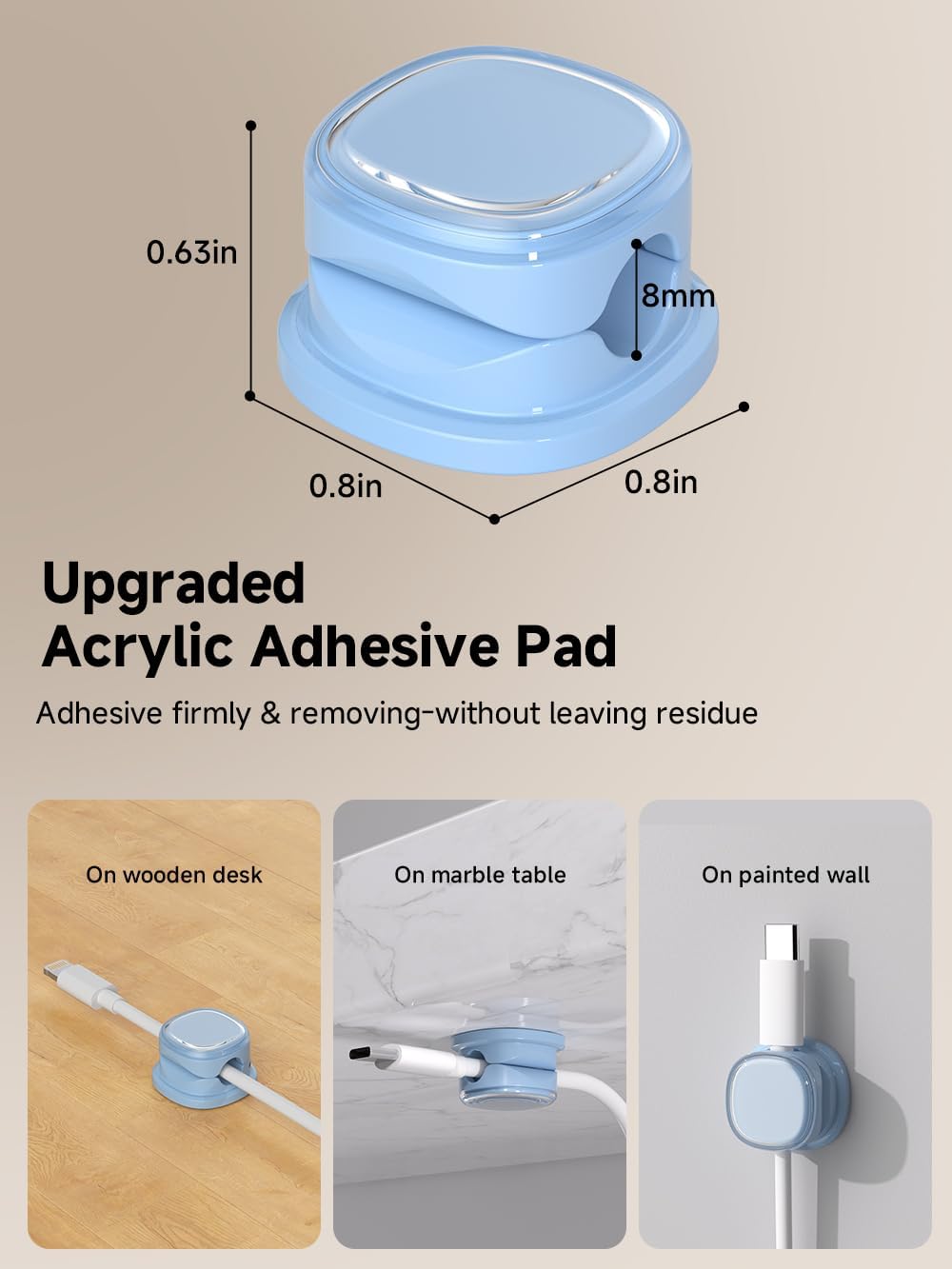 - No-Residue Acrylic Adhesive : Unlike ordinary adhesive tapes, our cable holder organizer utilizes the acrylic adhesive that is stronger and leaves no residue and won't damage your desk / nightstand or walls when removed. Just simply stick the wire holder organizer to any smooth and dry surface, such as wooden table, glass, or ceramic tiles, etc