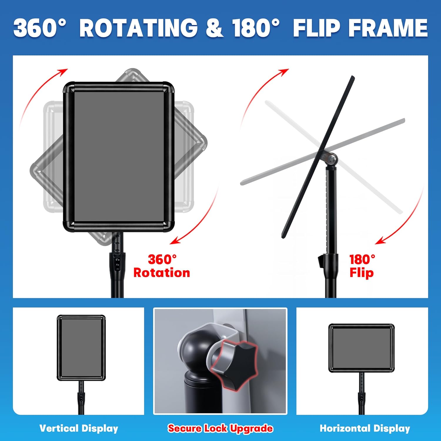 - ✔ 360° Adjustable Sign Stand - The VAIIGO 8.5x11" floor standing sign holder adjusts from 35" to 50" tall with a 360° rotating and 180° flipping frame, offering flexible multi-angle viewing for displays