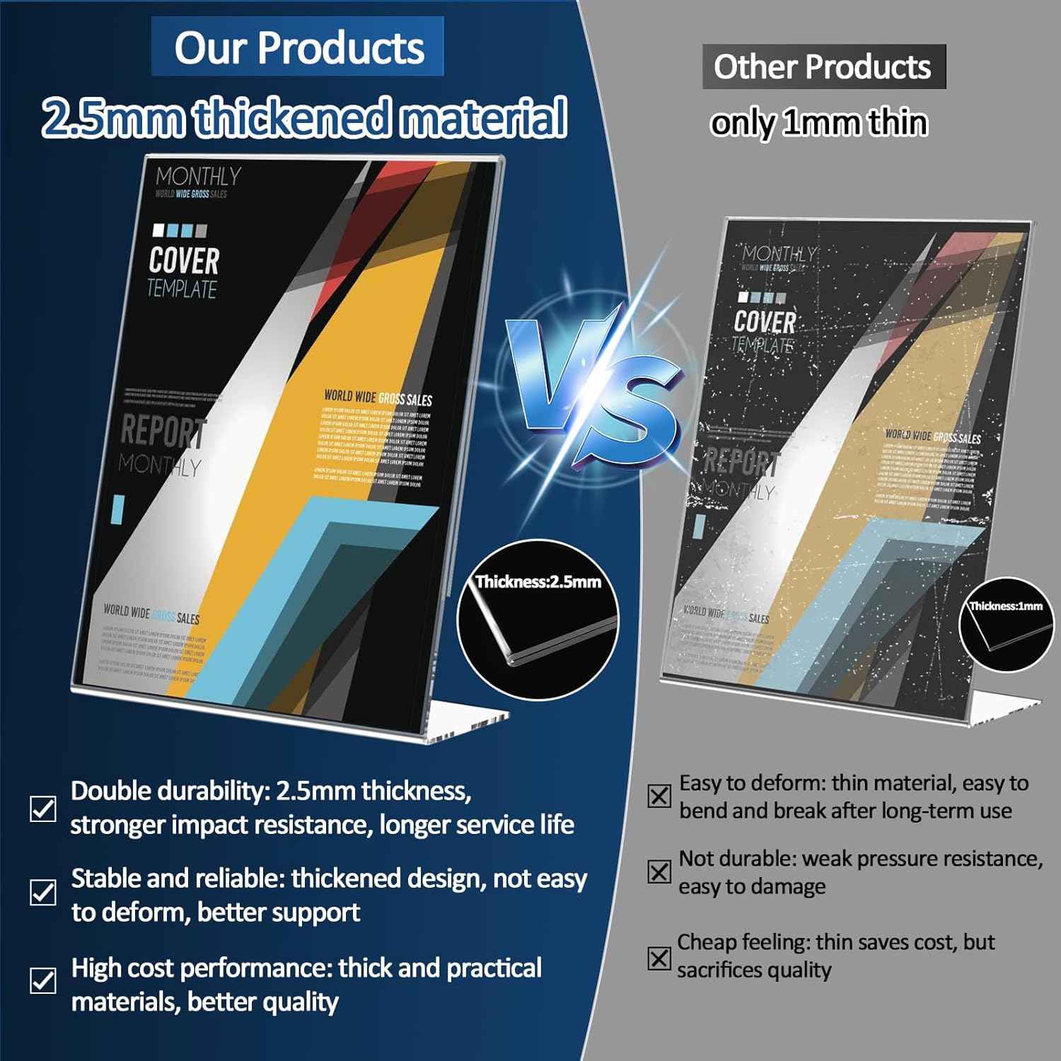 - High Quality: The sign display holder is made of high-quality, crystal-clear acrylic with polished edges to ensure both safety and aesthetics. The durable acrylic material is resistant to wear. The table paper stand offers long-lasting performance