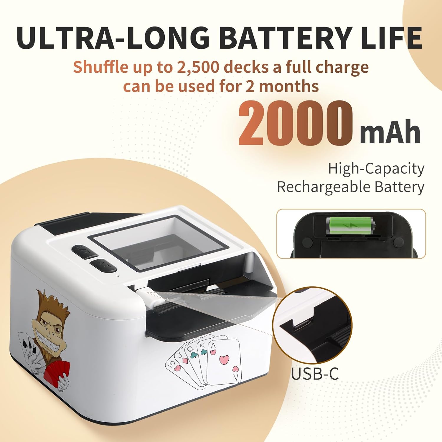 - 【Rechargeable Battery Auto Card Shuffler】The electric card shuffler has a built-in 2000mAh large-capacity rechargeable battery, even after hours of different games. It can shuffle up to 3000 decks of cards after a full charge. USB charge cable included. Removable battery, Extend the life of shuffler.