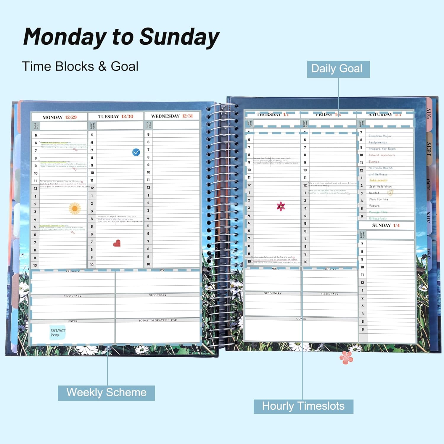 - ENHANCED ORGANIZATION TOOLS: ①Smartly designed extra pages support seamless planning, from yearly strategies down to hourly tasks.②Ultra-smooth thick 120gsm paper resists ink bleed. ③Each month features a unique, full-color scenic backdrop to inspire creativity and refresh your focus. ④Sturdy hardcover with reinforced spiral Binding for daily heavy use. ⑤Quick-access tear-resistant monthly tabs for instant page flipping.